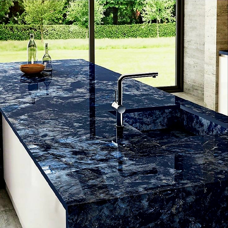 Black granite is a top choice for modular kitchns. It gives a clean and modern look and hides stains well. Black galaxy and jet black granite are widely used options.