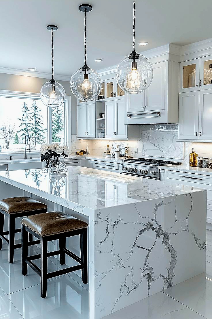 Proper lighting highlights the natural marble patterns and keeps the kitchen functional.